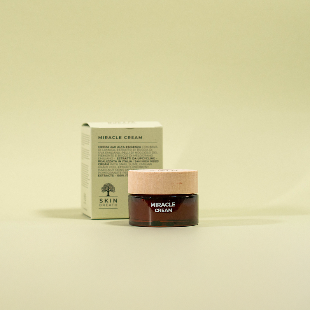Con bava di lumaca, estratto di buccia di uva emiliana, pelli di nocciolo del Piemonte e bucce di melograno emiliano.